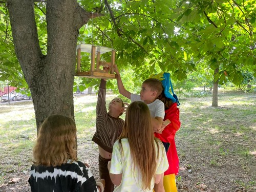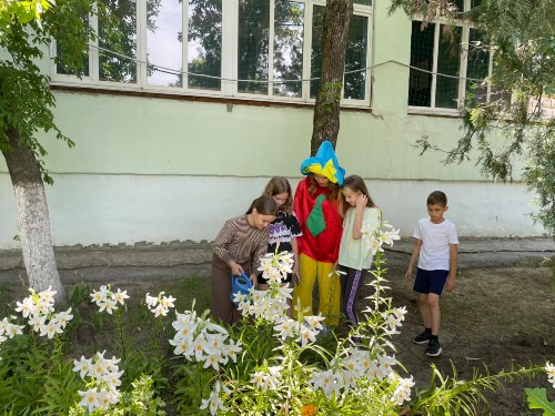 Сегодня в лагере "Метеор" Был день добрых дел. Дети учили Незнайку кормить в кормушке птиц, ухаживать за цветами на клумбе, приводить в порядок учебники.