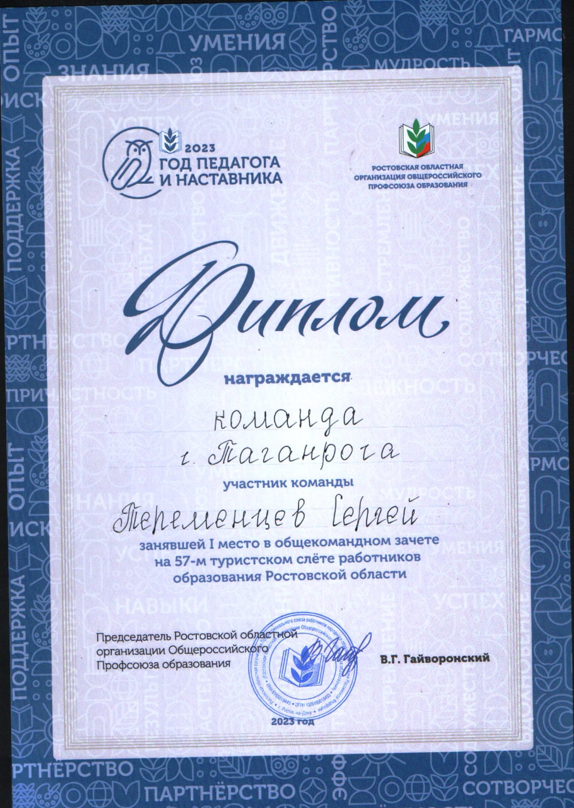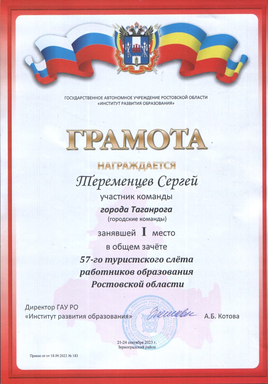 с 21 сентября по 24 сентября 2023 года состоялся 57 — ой туристский Слёт работников образования Ростовской области, который проходил в Зерноградском районе, хутор Гуляй-Борисовка. В составе делегации города Таганрога принял участие учитель МОБУ СОШ № 35 Сергей Анатольевич Теременцев. Поздравляем команду с заслуженной победой!!!